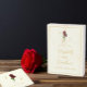 Elegancia intemporal: boda tradicional de rosas rojas minimalistas con tipografía de escritura dorada y fondo de marfil.