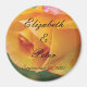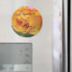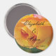 Un imán boda de novias divertidas con un fondo rosa amarillo ruborizante con sus nombres y fecha.