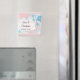 Imán de agradecimiento con hermosas flores azules sobre un fondo rosa. Una imagen de una página de cuaderno con forma rectangular superpuesta en la parte superior para que escribas tu texto dentro.