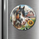 imán de bonito con un caballo manchado de color marrón, negro y blanco rodeado de girasoles y un rústico granero rojo al fondo. Es ideal para una casa de campo o para un tema rústico o para cualquiera que ame los caballos.