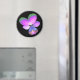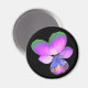 Este imán .presenta una fotografía de una flor Pansy salvaje. La foto ha sido pintada artificialmente, lo que ha resultado en una marsopa con pétalos rosados brillantes de color violeta con puntas verdes de pétalos y un centro azul profundo. El fondo es negro para hacer que la flor destaque.
