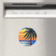 Silueta de palmeras de colores azules y naranjas y olas oceánicas en una playa de arena generan obras de arte.