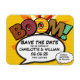 Personaliza con tus nombres y detalles para anunciar la fecha de tu evento especial. Tema de arte pop de cómic moderno, divertido diseño retro, perfecto para bodas, fiestas de compromiso, baby showers, bautizos, fiestas de aniversario, celebraciones de graduación, fiestas de cumpleaños y otros eventos especiales durante todo el año. Un diseño genial, trendy y divertido que pone el ¡boom! en tu día. Diseñado por Thisisnotme
