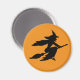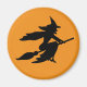 Una bruja malvada negra volando frente a la luna naranja de Halloween en su escoba.