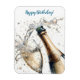Una hermosa imagen ilustrada de una botella de champán vertida en una copa de cristal. El champán está burbujeante y brillante en la luz, con gotitas de líquido salpicando por ahí, creando un ambiente enérgico y de celebración.
