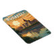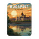 Diseño de viaje vectorial retro de Budapest en estilo emblema. Budapest, la capital de Hungría, está dividida por el río Danubio. Su Puente Cadena del siglo XIX conecta el barrio montañoso de Buda con la Pest plana.