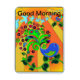 Un pájaro azul brillante con una cola extravagante en el fondo de la salida del sol. Puede cambiar el texto que dice "Buenos días" si lo desea.