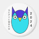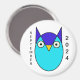 Imaginen un imán pequeño y redondo con un fondo blanco limpio. En el centro se encuentra un búho azul vibrante, con sus plumas ricas en diferentes tonalidades de azul, desde el cobalto profundo hasta el azul celeste más claro. El búho tiene ojos grandes y penetrantes que le dan una alerta y una expresión sabia. Sus alas están bien colocadas en sus lados, mientras que pequeños detalles como las motas blancas o los acentos azules más claros decoran su cuerpo, añadiendo textura. El pico de la lechuza es agudo y puntiagudo, posiblemente un color contrastante como el naranja o el negro, destacándose contra el azul frío. Sus pies son pequeños, descansando suavemente sobre la superficie blanca del imán. El diseño general es sencillo pero sorprendente, con un contraste entre el búho azul y el fondo blanco que crea una visión atractiva y encantadora.