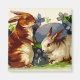 Ilustracion lindo de dos conejos conejitos en un campo de trébol con un huevo de Pascua teñido. Tarjeta coincidente: