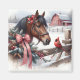Cultivando imán de Navidades temáticos con un caballo marrón bonito con un arco rojo y un cardenal rojo bonito en la valla con un granero rústico en el fondo de un arte acuático nevado de invierno.