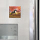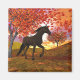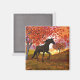 Un imán con mi arte computarizado de una escena de otoño con hojas de arce naranja volando alrededor de un caballo galopando a través de los árboles.