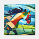 AI creó una impresión que representaba una interpretación cubista de un caballo galopando alrededor de un prado rodante mientras las nubes pasaban por la brisa sobre los árboles lejanos en el horizonte del paisaje.