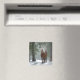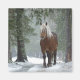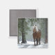 Un imán con una fotografía de un caballo marrón con una larga melena blanca. En un bosque con copos de nieve cayendo por todos lados.