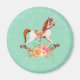 Un imán con una imagen encantadora y fantasiosa de un mecedor a la antigua con un ramo de flores de bonito rosa y amarillo. El fondo es un patrón de damasco de color verde claro.