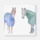 Ilustracion a lápiz de color de un poni de castaño y un caballo gris con sus alfombras de asistencia de Nueva Zelanda.