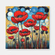 A.I. la impresión asistida de espías rojas gigantes vibrantes con tallos largos y delgados se paran en un fondo abstracto de tonos azules, amarillos y blancos.