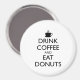 Imán con una taza de café con "CAFÉ BEBIDO Y DONUTS DE COMIDA". Diseño basado en el poster británico de moral de 1939 "Mantenga la calma y siga adelante". Para los amantes del café.