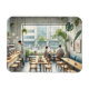 Perfecto para los amantes del café y de los viajes. La pintura acuática refleja el ambiente tranquilo y moderno de una cafetería del distrito Da'an de Taipei. El mobiliario de madera clara y las paredes blancas, complementadas con grandes cristaleras, crean un espacio amplio y acogedor. La vegetación de las pequeñas macetas y de las viñas colgantes aporta vibrantes toques de color. En un mostrador de hormigón pulido adornado con jarrones de judías se ve a un barista con una camisa blanca y fresca preparando meticulosamente café. En una mesa junto a la ventana, un joven con capuchas grises en su laptop junto a un americano helado. En las cercanías, un grupo de amigos comparte galletas matcha y un café con leche en una taza de cerámica, lo que aporta calidez a la escena. Fuera de las ventanas, se ven las dinámicas calles de Taipei, con motos y peatones que ofrecen un ambiente animado. La composición general combina elementos naturales con un diseño minimalista que refleja la cultura cafetera de Taipei.
