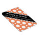 Imán Premium: Guarde la invitación del imán flex plano Date con un patrón de puntos polka variado con tamaños alternados de círculos blancos sobre un naranja al estilo de un café. "Save the Date", la fecha, y tus nombres se imprimen diagonalmente en blanco sobre una franja negra diagonal descentrada. Estos imanes son planos, lo que los hace perfectos y cómodos para el envío (no se proporcionan sobres).
