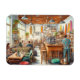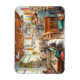 La pintura acuática muestra el animado y ecléctico interior de una pequeña cafetería de San Diego. El mobiliario, de madera y sillas coloridas, es de color, con sofás de época y mesas de madera, crea un espacio vibrante y acogedor. Las paredes están decoradas con tablas de surf, obras de arte local y posters retro, que reflejan una estética costera relajada. Las plantas colgadas y las luces de hadas que cuelgan del techo le dan un toque original. Un mostrador de madera de renombre repleto de bollería, tazas de cerámica y una máquina espresso brillante se erige como el corazón del café, donde un barista con una camisa hawaiana prepara café. Los huéspedes se sientan en grupos animados, tomando café de copas vibrantes o trabajando en laptops, mientras que la luz solar suave se filtra a través de grandes ventanas, iluminando el alegre ambiente de la cafetería.