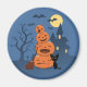 Un gato negro y una escoba de brujas cerca de una pila de calabazas que se están cayendo. Un árbol muerto, una mansión espeluznante, algunos murciélagos y la luna son vistos en el fondo.