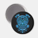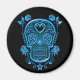 Este impresionante diseño presenta un cráneo de azúcar del Día de los Muertos con un fondo negro puro. Las líneas complejas y los patrones de puntos que decoran el cráneo son de un color azul intenso que se resalta dando al diseño un aspecto 3D. Cuatro rosas rodean el cráneo con delicadas viñas que llegan hasta una estrella de cinco puntos en la base del patrón. Un gran corazón se sienta en el centro de la frente con movimientos fluidos a ambos lados. Este hermoso diseño de cráneo de azúcar hace un imán divertido y elegante.