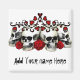 Una imagen gráfica con cuatro cráneos horizontales con rosas rojas encajadas entre ellas y coronadas con corazones negros y rojos y trabajo de desplazamiento.