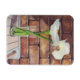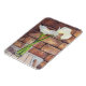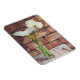 Un cuadro acuático con dos elegantes lámparas de calila blancas en un jarrón de cristal transparente con una pared de ladrillo como fondo.