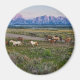 Esta foto muestra un rebaño de caballos corriendo frente a la cordillera del Gran Tetón en la zona rural de Wyoming durante la madrugada.