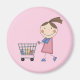 Un chica con una figura de palos con un carro de la compra en un viaje de compras en camisetas de compras Chicas, tazas, tarjetas, caramelos, pegatinas, bolsas de té, imanes y más.