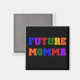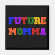 Camisetas, caramelos, tarjetas, pegatinas, botones, bolsos de tote, mousepads y otras prendas de Future Momma con texto de colores primarios.