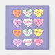 Un original ilustracion de marca de una hilera de corazones de caramelo de color pastel, cada uno con un dicho diferente. ¡Perfecto para el El día de San Valentín!