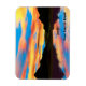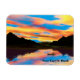 Una canoa cruza un lago montañoso que refleja los hermosos naranjas y azules de una colorida puesta de sol. Añade tu propio texto.