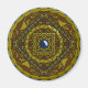 Esta mandala temática de Capricornio presenta una piedra lapis lazuli rodeada por el símbolo del signo, la constelación y el símbolo alquímico de la Tierra entre filigree y tejidos.