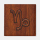 A Capricorn zodiac symbol in brown mahogany wood grain style print background. A modern urban racy design for a great custom birthday gift idea.