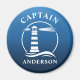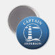 Elegante imán de refrigerador redondo con capitán u otro título, nombre personalizado y un faro clásico personalizado con olas oceánicas en blanco en tonos azules o colores de fondo que se correspondan con la decoración. Hace un gran regalo único.