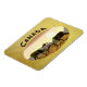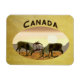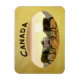 Dos toros de caribú luchan durante la rutina de caída en el extremo norte mientras el sol se pone en el fondo. También aparece el texto "Canadá". La imagen es superpuesta sobre un fondo de cuero de cerebro.