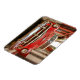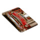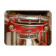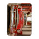 Auto clásico americano en La Habana, Cuba con apariencia de velocidad en la estrecha calle rodeada de edificios de color a juego alrededor del auto (rojo y blanco).