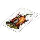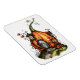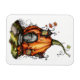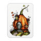 La imagen representa una casa caprichosa de cuento de hadas en forma de gran calabaza naranja vibrante. La calabaza se ha transformado en una acogedora vivienda con una puerta de madera en la parte delantera, dos pequeñas ventanas en los lados y dos pintorescas estructuras tipo torreta en la parte superior con tejados rojos. La casa está rodeada de viñas retorcidas y hojas de otoño, lo que añade un ambiente mágico y encantador. El entorno sugiere un ambiente sereno y de bosques, perfecto para un hada de cuentos o una criatura mágica.