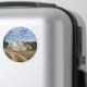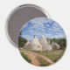 Imán fotográfico redondo con piedra blanca, casas de trullos tradicionales en forma de cono, con una pasarela y un jardín con olivos bajo un bonito cielo en un complejo vacacional cerca de Alberolbello en Puglia/Apulia, en el sur de Italia.