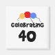 Tres globos de colores primarios y texto negro que dice "Celebrando 40" en tarjetas de 40 años, camisetas, tazas y más.