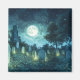 Concepto de Halloween, cementerio encantado con lápidas brillantes y ilustracion de luna llena.