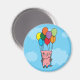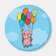Con un ilustracion digital de cerdo rosado usando un montón de globos multicolores para volar alto al cielo azul turbio.