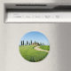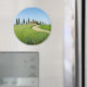 Imán fotográfico redondo con un camino curvado a través de los cultivos de granos hacia una villa agrícola con una hilera de cipreses frente a ella cerca de Pienza en el valle Val d'Orcia en Toscana, Italia.