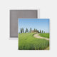 Imán fotográfico de souvenirs con un camino curvado a través de los cultivos de cereales hacia una casa de campo con una hilera de cipreses frente a ella cerca de Pienza en el valle Val d'Orcia en Toscana, Italia.