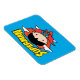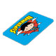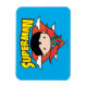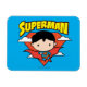 Echa un vistazo a Chibi Superman volando en las nubes con su súper nombre de héroe sobre la cabeza y forma de escudo de puntos de polka rojo detrás de él.