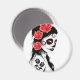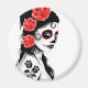 Este diseño inspirado en el Día de los Muertos presenta a una hermosa mujer con patrones de cráneo de azúcar en su cara. Tres rosas rojas aparecen en su pelo negro azabache con dos rosas más tatuadas en su brazo. La chica está de pie a un lado con la cabeza inclinada hacia el espectador. Su piel blanca y pura resalta en el pelo negro y se funde perfectamente en el fondo de la luz. Este diseño único es una impresionante representación de este Día de la Muerte.