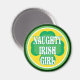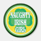 Un Chica irlandés travieso con un gran texto blanco con un fondo de shamrock verde en un círculo.