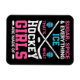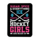 Imán flexible de temas de hockey para el chica de hockey con calcetines de hockey, palos y cascos con texto rosa, blanco y azul que dice Azúcar, especias y todo el hielo ¡De que están hechos los Chicas de hockey!