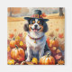 Una pintura acuarela de un perro alegre sentado en medio de un montón de hojas caídas vibrantes, rodeado de pequeñas calabazas y bellotas dispersas. El perro lleva un pequeño gorra peregrino y vigas de alegría, capturando el espíritu del Día de Acción de Gracias. Como telón de fondo, los campos de suave cosecha y los árboles de tonos dorados crean un ambiente campestre tranquilo. Las texturas suaves y los tonos cálidos y mudos del otoño le dan al lugar un ambiente acogedor y nostálgico, perfecto para celebrar la belleza de la temporada.